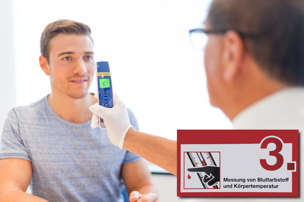 Danach werden die Körpertemperatur und der Eisenwert, bzw. Blutfarbstoffgehalt (Hämoglobinwert) festgestellt. Dazu reicht ein winziges Tröpfchen Blut durch einen kleinen Pieks ins Ohrläppchen oder einen Finger aus.