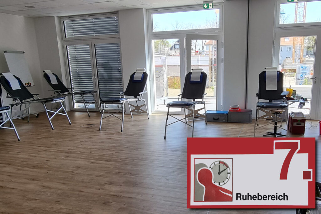 Nach der Blutentnahme wechseln Sie auf eine Liege in den Ruhebereich. Sie sollten mindestens 10 Minuten ruhen, damit sich Ihr Kreislauf auf die veränderten Bedingungen nach der Blutentnahme gewöhnen kann.