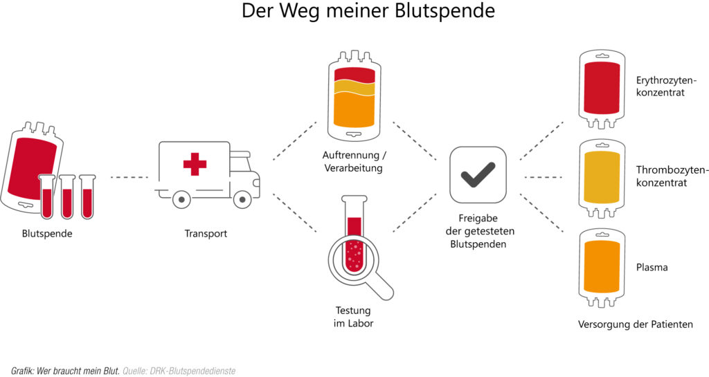 Nach dem Transport beginnt die Weiterverarbeitung Ihrer Blutsspende im Labor. Dort wird ihre Blutspende sorgfältig untersucht und in seine drei wesentliche Bestandteile aufgeteilt – Erythrozyten-, Thrombozytenkonzentrat und Plasma. Denn in der modernen Medizin wird das Blut nicht mehr in seinem natürlichen Zustand verabreicht, sondern es werden nur die Blutpräparate verwendet, die für die Genesung oder Behandlung benötigt werden.